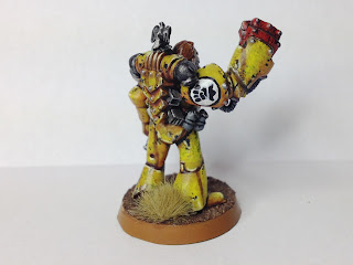 The right shoulder is a rogue trader power fist with a recent assault squad arm and force axe.